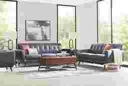 Refined with a smart mix of curves and lines, the Greyson chair showcases style that lands just right in the lounge, the study, or the living room. Exquisitely modern, this seat's midcentury pedigree shines through in its distinct u-shaped frame, wood base in a light walnut finish, and canted tapered legs. Upholstered in blue top grain leather where the body touches, stylish details include track arms, biscuit-tufted backs, and top-stitched seams throughout. Upholstery:Top grain leather where the body touches with polyurethane sides and backs.