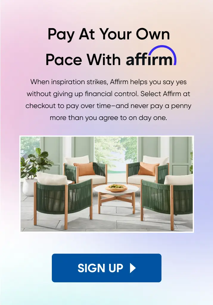 Rates from 10–36% APR. For example, a $800 purchase might cost $72.21/mo over 12 months at 15% APR. Payment options through Affirm are subject to an eligibility check, may not be available everywhere, and are provided by these lending partners: affirm.com/lenders. Options depend on your purchase amount, and a down payment may be required. Estimated payment amount may exclude taxes and shipping. For licenses and disclosures, see affirm.com/licenses.