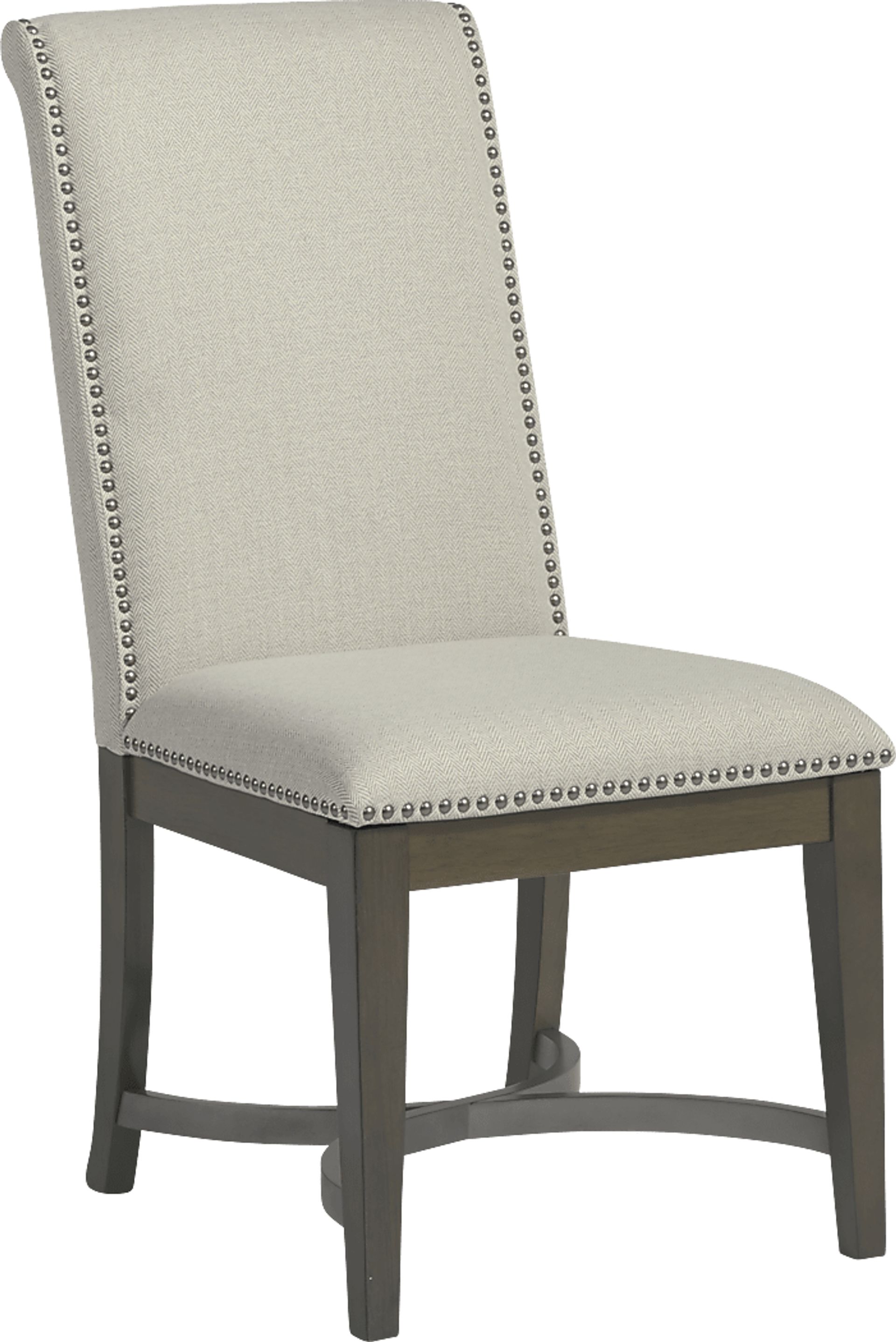 Featuring stylishly transitional nailhead accents and a sturdy construction of poplar wood solids and Mindy veneers in a warm brown finish, the Abbey Court dining chair embodies chic appeal. Its all-over neutral beige upholstery pairs nicely with a variety of color schemes, while its generously padded design lets you fully relax and enjoy your dining experience.