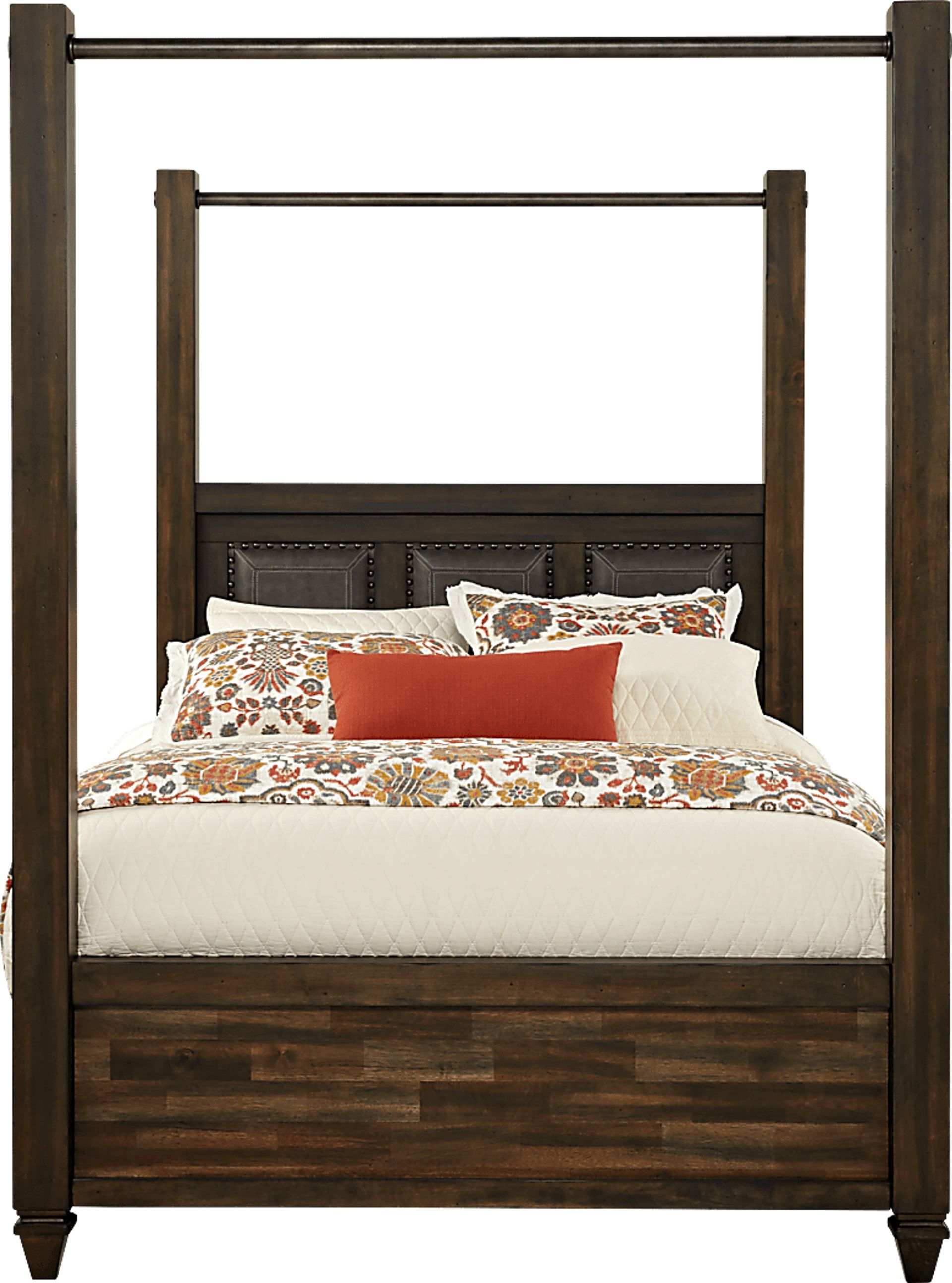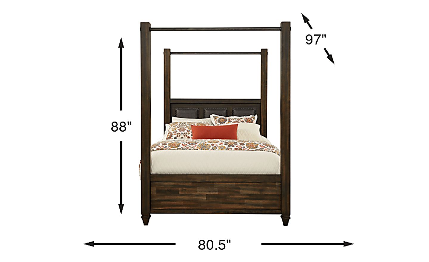 The Abbeywood poster bed mixes traditional design with old world styling to create a wonderful place to relax at the end of the day. Crafted with poplar wood and acacia veneers in a rich brown finish, the headboard features sleek upholstered panels lined in nailhead trim and high posts with metal accents. Subtle distressing details add a charming warmth to your bedroom. Mattress and foundation (if required) sold separately. Bed shown is queen size.