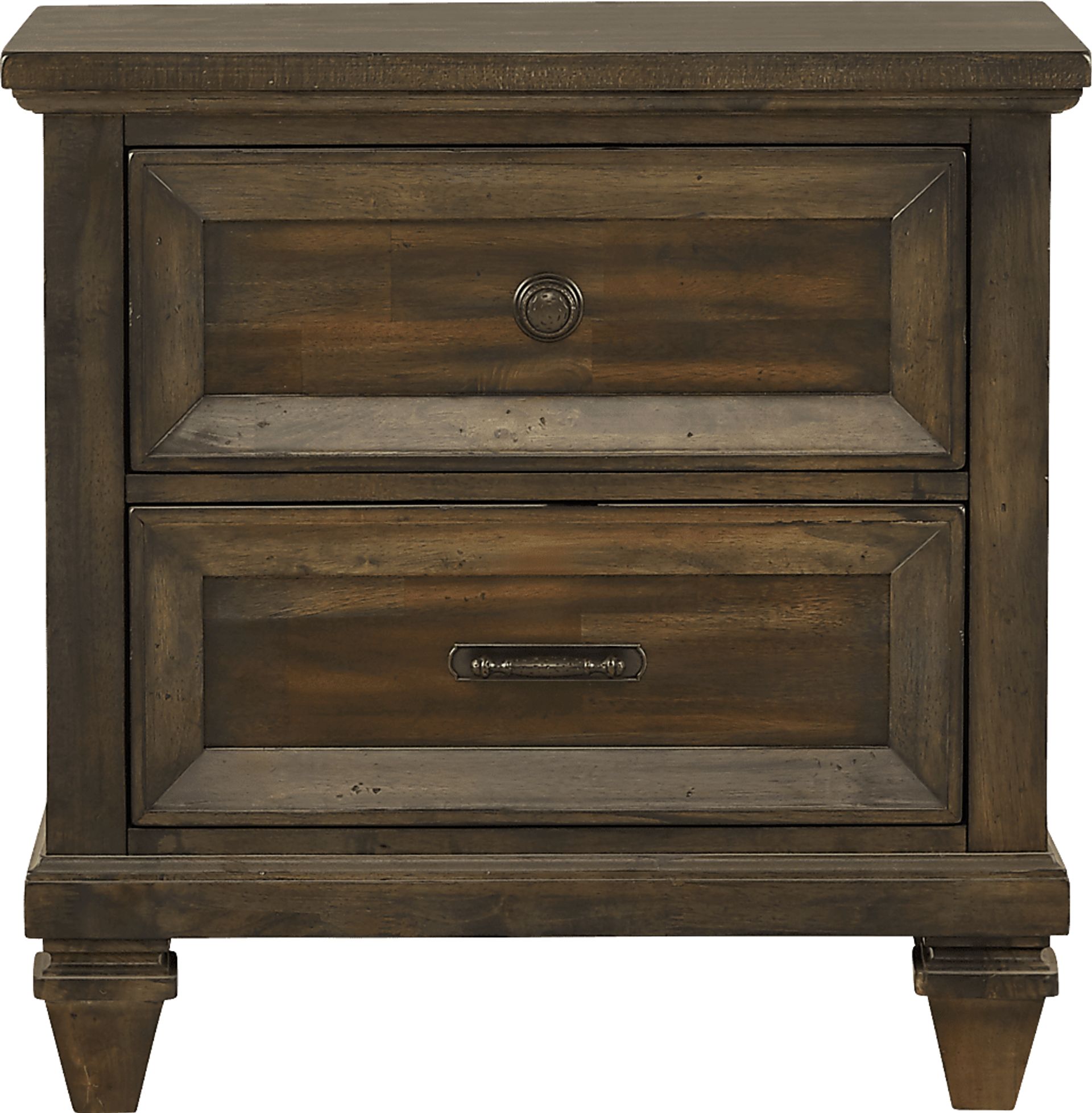 Perched at your bedside, the Abbeywood nightstand adds a useful touch to your bedroom. Crafted from poplar wood and acacia veneers, the rich brown finish features subtle distressed details for a charming touch. Two drawers are perfect for storing bedside necessities, while the smooth top is a great place for a lamp, or to display a favorite picture. Accented by antiqued bronze hardware, each drawer utilizes both French and English dovetail drawer construction for stability.