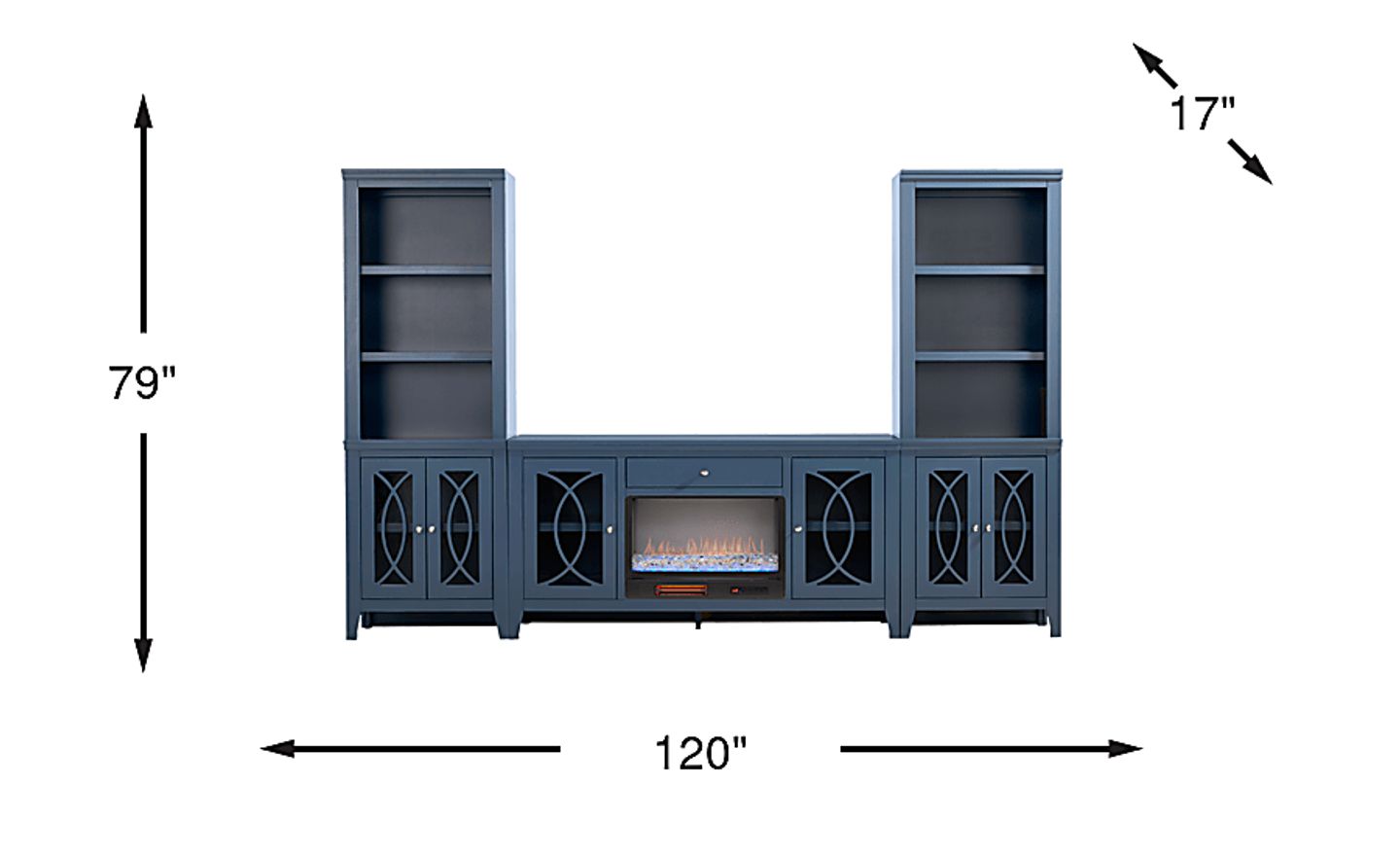 Bring sleek style and smart storage to your living room with the Abbie II wall unit. The console features a wide center drawer for essentials and glass-front cabinets with geometric overlays that neatly conceal electronics, decor and more. At its center, an energy-saving LED firebox adds both warmth and ambiance, complete with remote-controlled heat and ambient lighting with four color-changing options to create a cozy atmosphere. Flanking piers echo the design of the console, each offering three open shelves above a closed cabinet base, creating space for both display and storage. A gorgeous blue finish brightens the entire set, while brushed silver hardware adds a refined final touch.