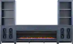 Bring sleek style and smart storage to your living room with the Abbie II wall unit. The console includes three spacious drawers along the top for essentials. At its center, an energy-saving LED firebox adds both warmth and ambiance, complete with remote-controlled heat and ambient lighting with four color-changing options to create a cozy atmosphere. Flanking piers echo the design of the console, each with three open shelves above a closed cabinet base that has glass-front doors featuring geometric overlay detailing that helps conceal essentials with ease. A gorgeous blue finish brightens the entire set, while brushed silver hardware adds a refined final touch.