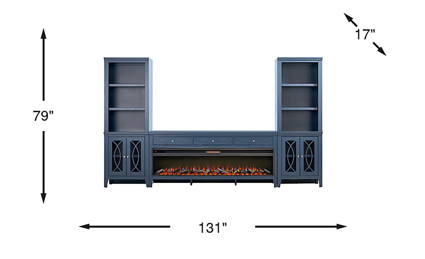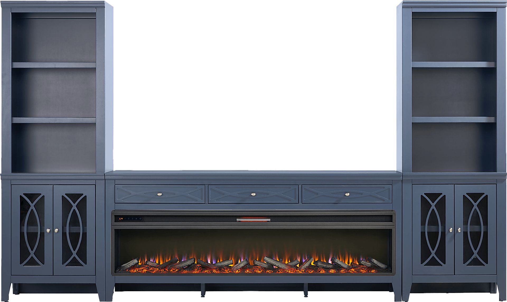 Bring sleek style and smart storage to your living room with the Abbie II wall unit. The console includes three spacious drawers along the top for essentials. At its center, an electric log fireplace provides both warmth and ambiance, showcasing 3D flame effects that can be adjusted with a convenient remote. A built-in timer allows settings from 30 minutes to 60 hours, while the adjustable thermostat ranges from 62 to 82 degrees for personalized comfort. Flanking piers echo the design of the console, each with three open shelves above a closed cabinet base that has glass-front doors featuring geometric overlay detailing that helps conceal essentials with ease. A gorgeous blue finish brightens the entire set, while brushed silver hardware adds a refined final touch.
