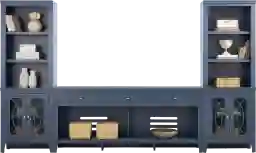 Bring sleek style and smart storage to your living room with the Abbie II wall unit. The center console includes three spacious drawers along the top for essentials and two wide open shelves with cutouts in the back for easy cord management. Flanking piers echo the design of the console, each with three open shelves above a closed cabinet base that has glass-front doors featuring geometric overlay detailing that helps conceal essentials with ease. A gorgeous blue finish brightens the entire set, while brushed silver hardware adds a refined final touch.