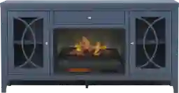 Bring sleek style and smart storage to your living room with the Abbie II console. Finished in a gorgeous blue, this piece features a wide center drawer for essentials and glass-front cabinets with geometric overlays that neatly conceal electronics, decor and more. At its center, an electric log fireplace provides both warmth and ambiance, showcasing 3D flame effects that can be adjusted with a convenient remote. A built-in timer allows settings from 30 minutes to 60 hours, while the adjustable thermostat ranges from 62 to 82 degrees for personalized comfort. Brushed silver hardware completes the look with a refined touch of contemporary elegance, making this console as functional as it is stylish.
