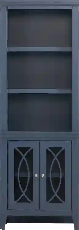 Sleek and versatile, the Abbie II bookcase pier offers three open shelves above a closed cabinet base that has glass-front doors featuring geometric overlay detailing that helps conceal essentials with ease. A gorgeous blue finish brightens the piece, while brushed silver hardware adds a refined final touch.