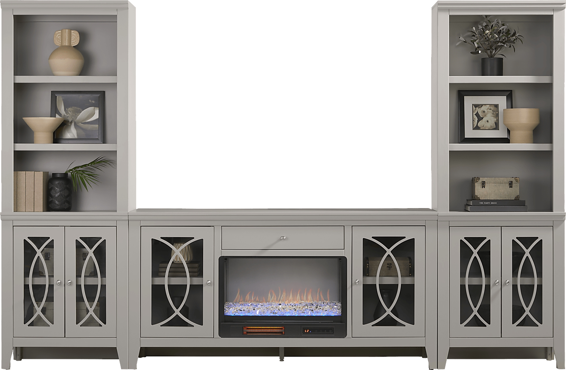 Bring sleek style and smart storage to your living room with the Abbie II wall unit. The console features a wide center drawer for essentials and glass-front cabinets with geometric overlays that neatly conceal electronics, decor and more. At its center, an energy-saving LED firebox adds both warmth and ambiance, complete with remote-controlled heat and ambient lighting with four color-changing options to create a cozy atmosphere. Flanking piers echo the design of the console, each offering three open shelves above a closed cabinet base, creating space for both display and storage. A gorgeous gray finish brightens the entire set, while brushed silver hardware adds a refined final touch.