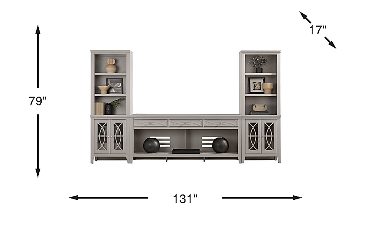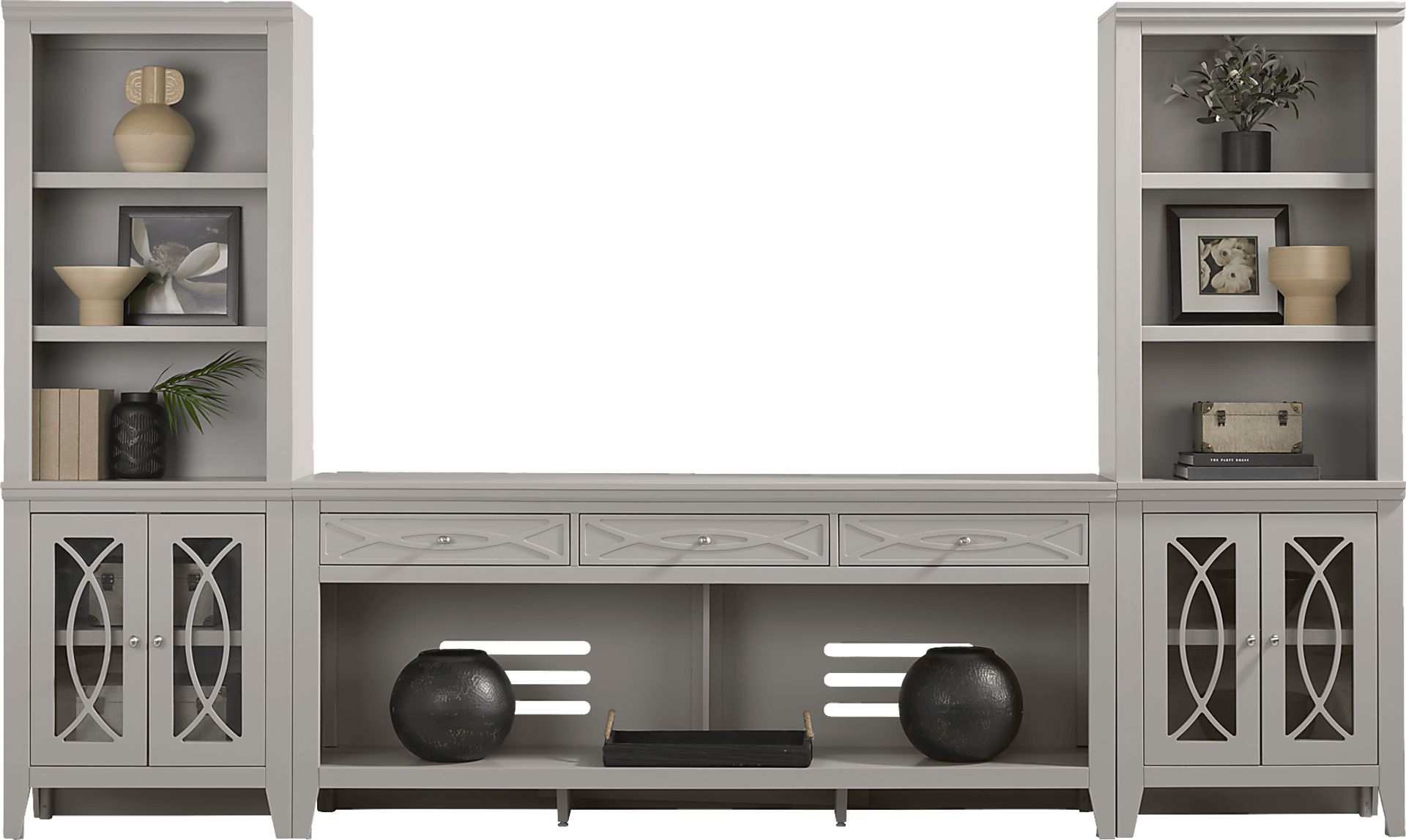 Bring sleek style and smart storage to your living room with the Abbie II wall unit. The center console includes three spacious drawers along the top for essentials and two wide open shelves with cutouts in the back for easy cord management. Flanking piers echo the design of the console, each with three open shelves above a closed cabinet base that has glass-front doors featuring geometric overlay detailing that helps conceal essentials with ease. A gorgeous gray finish brightens the entire set, while brushed silver hardware adds a refined final touch.