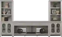 Bring sleek style and smart storage to your living room with the Abbie II wall unit. The center console includes three spacious drawers along the top for essentials and two wide open shelves with cutouts in the back for easy cord management. Flanking piers echo the design of the console, each with three open shelves above a closed cabinet base that has glass-front doors featuring geometric overlay detailing that helps conceal essentials with ease. A gorgeous gray finish brightens the entire set, while brushed silver hardware adds a refined final touch.