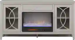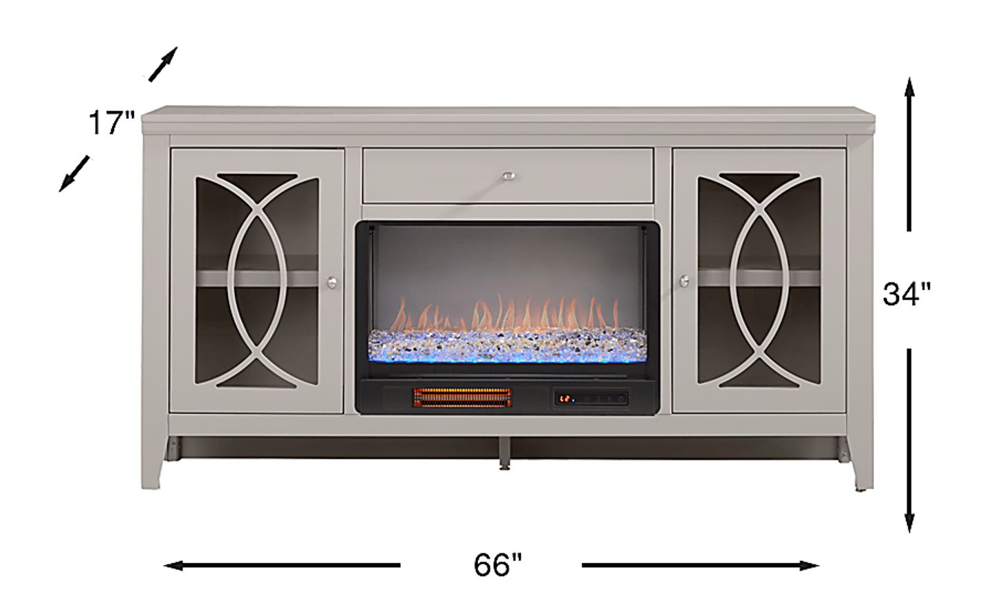 Bring sleek style and smart storage to your living room with the Abbie II console. Finished in a gorgeous gray, this piece features a wide center drawer for essentials and glass-front cabinets with geometric overlays that neatly conceal electronics, decor and more. At its center, an energy-saving LED firebox adds both warmth and ambiance, complete with remote-controlled heat and ambient lighting with four color-changing options to create a cozy atmosphere. Brushed silver hardware provides the final touch of contemporary elegance, making this console as functional as it is stylish.
