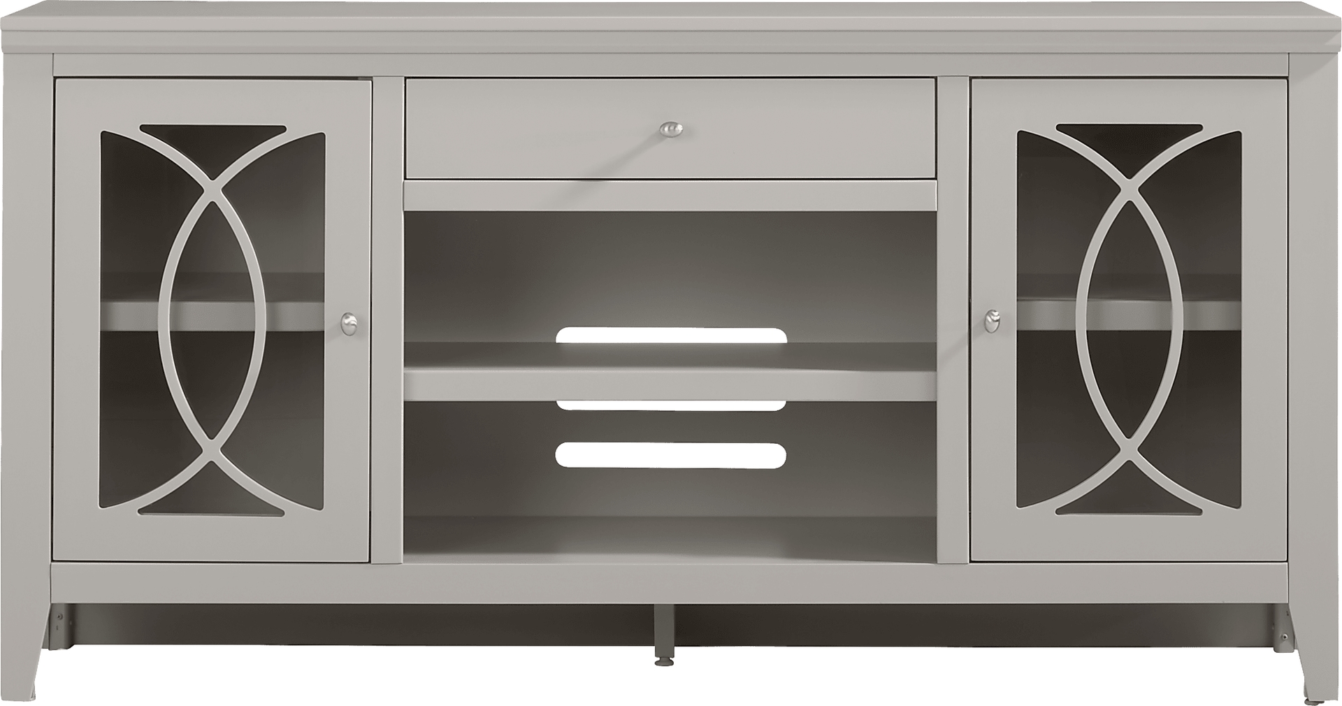 Bring sleek style and smart storage to your living room with the Abbie II console. Featuring a gorgeous gray finish, this console features a wide center drawer for essentials, two open shelves with cutouts for easy cord management and a pair of glass-front cabinets on each side. Each cabinet includes an interior shelf, making it easy to organize and display electronics, decor and more. Brushed silver hardware and geometric glass overlay detailing add a touch of contemporary elegance to this versatile storage solution.