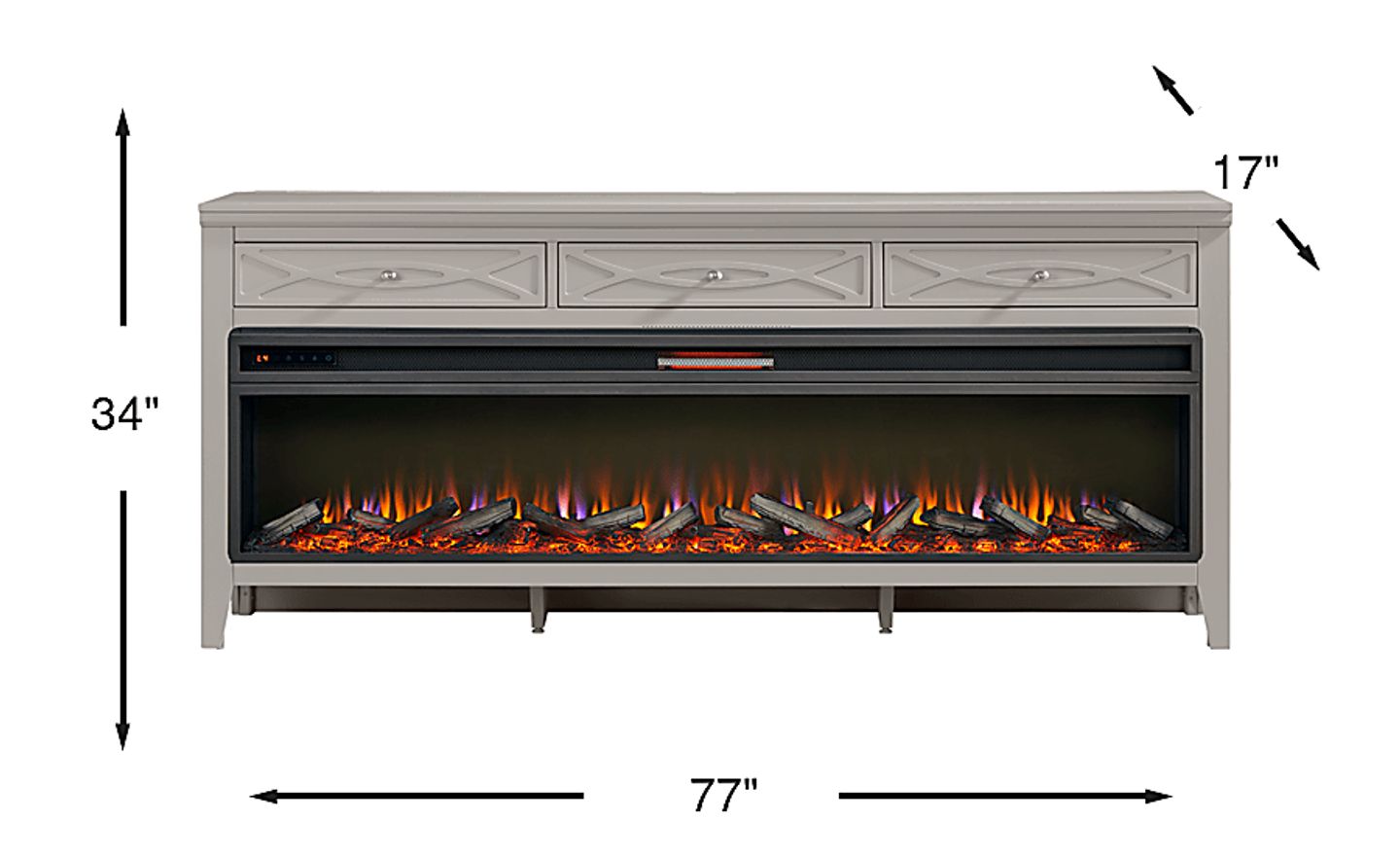 Bring sleek style and smart storage to your living room with the Abbie II console. Featuring a gorgeous gray finish, this console includes three spacious drawers along the top for essentials. At its center, an electric log fireplace provides both warmth and ambiance, showcasing 3D flame effects that can be adjusted with a convenient remote. A built-in timer allows settings from 30 minutes to 60 hours, while the adjustable thermostat ranges from 62 to 82 degrees for personalized comfort. Brushed silver hardware completes the look with a refined touch of contemporary elegance, making this console as functional as it is stylish.