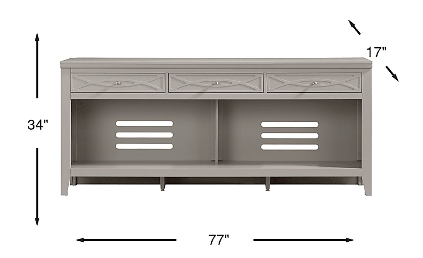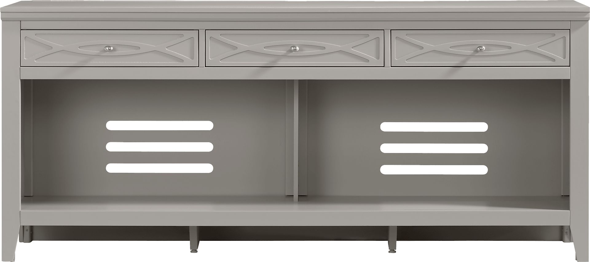 Bring sleek style and smart storage to your living room with the Abbie II console. Featuring a gorgeous gray finish, this console includes three spacious drawers along the top for essentials and two wide open shelves with cutouts in the back for easy cord management. Brushed silver hardware adds a refined touch, making this versatile piece both functional and contemporary in design.
