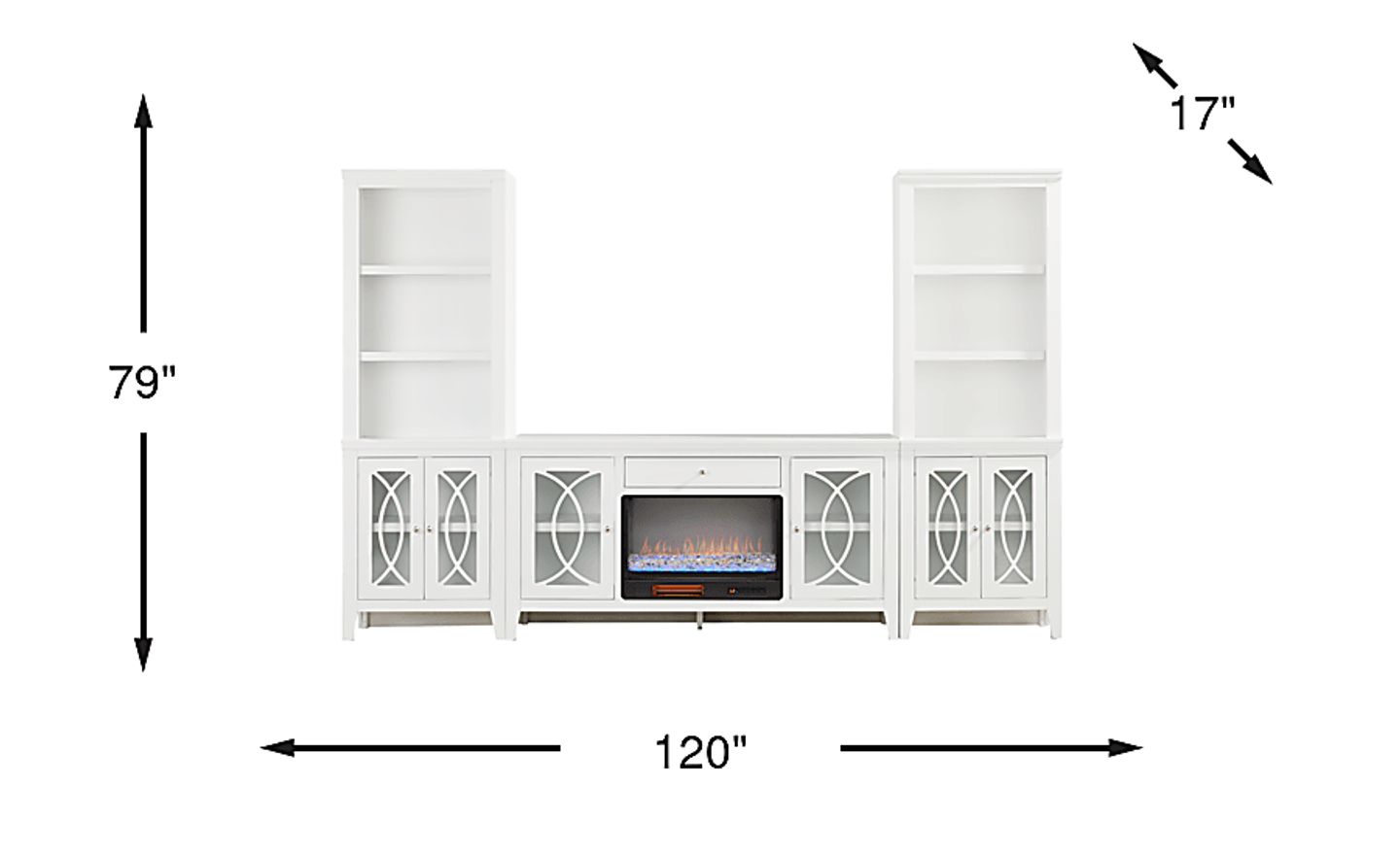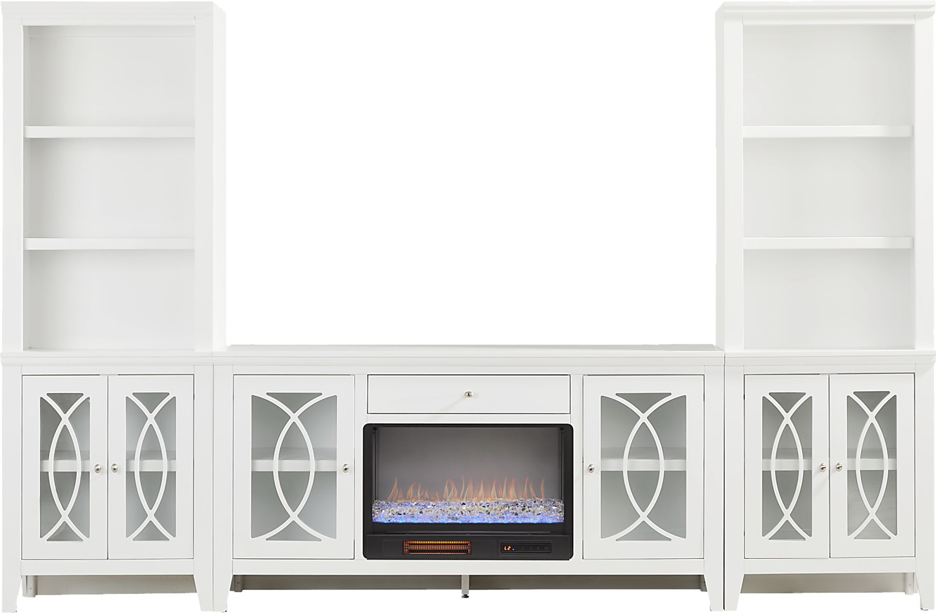 Bring sleek style and smart storage to your living room with the Abbie II wall unit. The console features a wide center drawer for essentials and glass-front cabinets with geometric overlays that neatly conceal electronics, decor and more. At its center, an energy-saving LED firebox adds both warmth and ambiance, complete with remote-controlled heat and ambient lighting with four color-changing options to create a cozy atmosphere. Flanking piers echo the design of the console, each offering three open shelves above a closed cabinet base, creating space for both display and storage. A gorgeous white finish brightens the entire set, while brushed silver hardware adds a refined final touch.