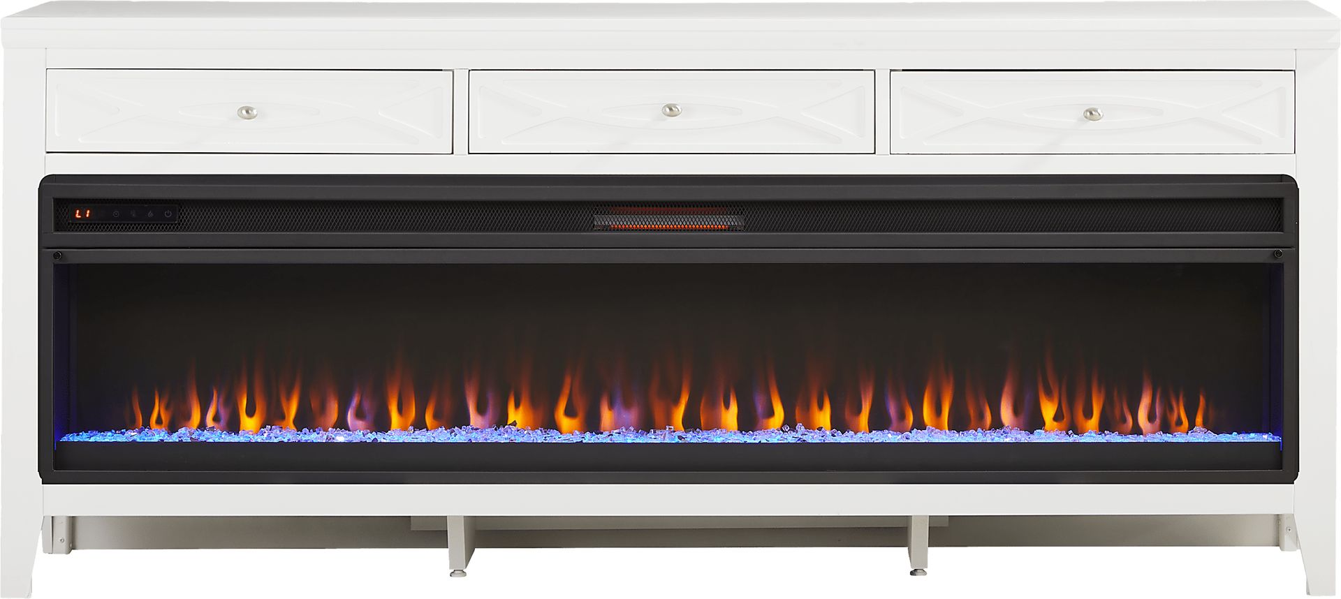 Bring sleek style and smart storage to your living room with the Abbie II console. Featuring a gorgeous white finish, this console includes three spacious drawers along the top for essentials. At its center, an energy-saving LED firebox adds both warmth and ambiance, complete with remote-controlled heat and ambient lighting with four color-changing options to create a cozy atmosphere. Brushed silver hardware provides the final touch of contemporary elegance, making this console as functional as it is stylish.