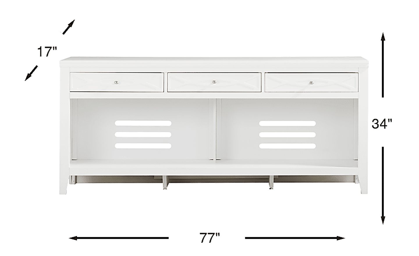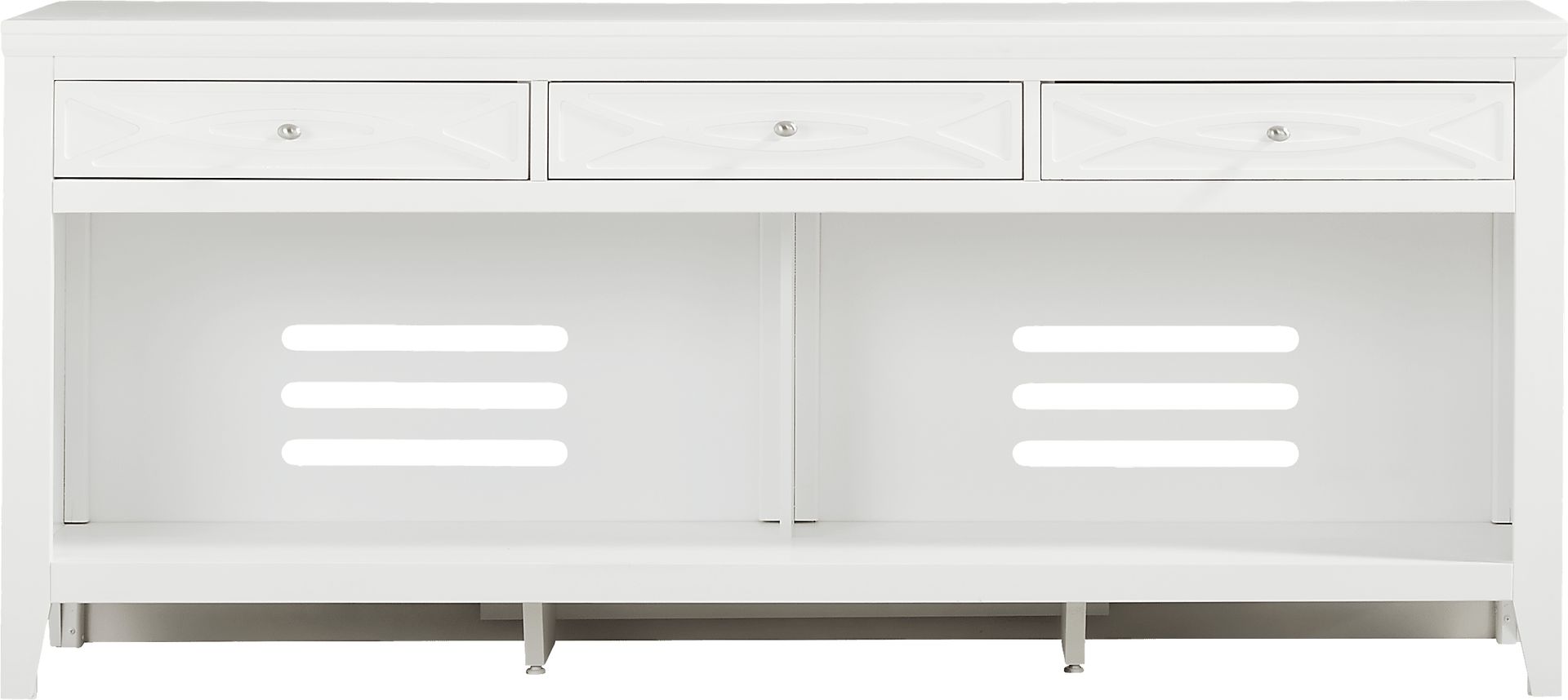 Bring sleek style and smart storage to your living room with the Abbie II console. Featuring a gorgeous white finish, this console includes three spacious drawers along the top for essentials and two wide open shelves with cutouts in the back for easy cord management. Brushed silver hardware adds a refined touch, making this versatile piece both functional and contemporary in design.