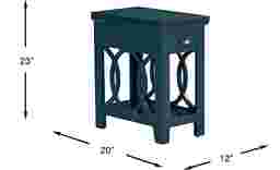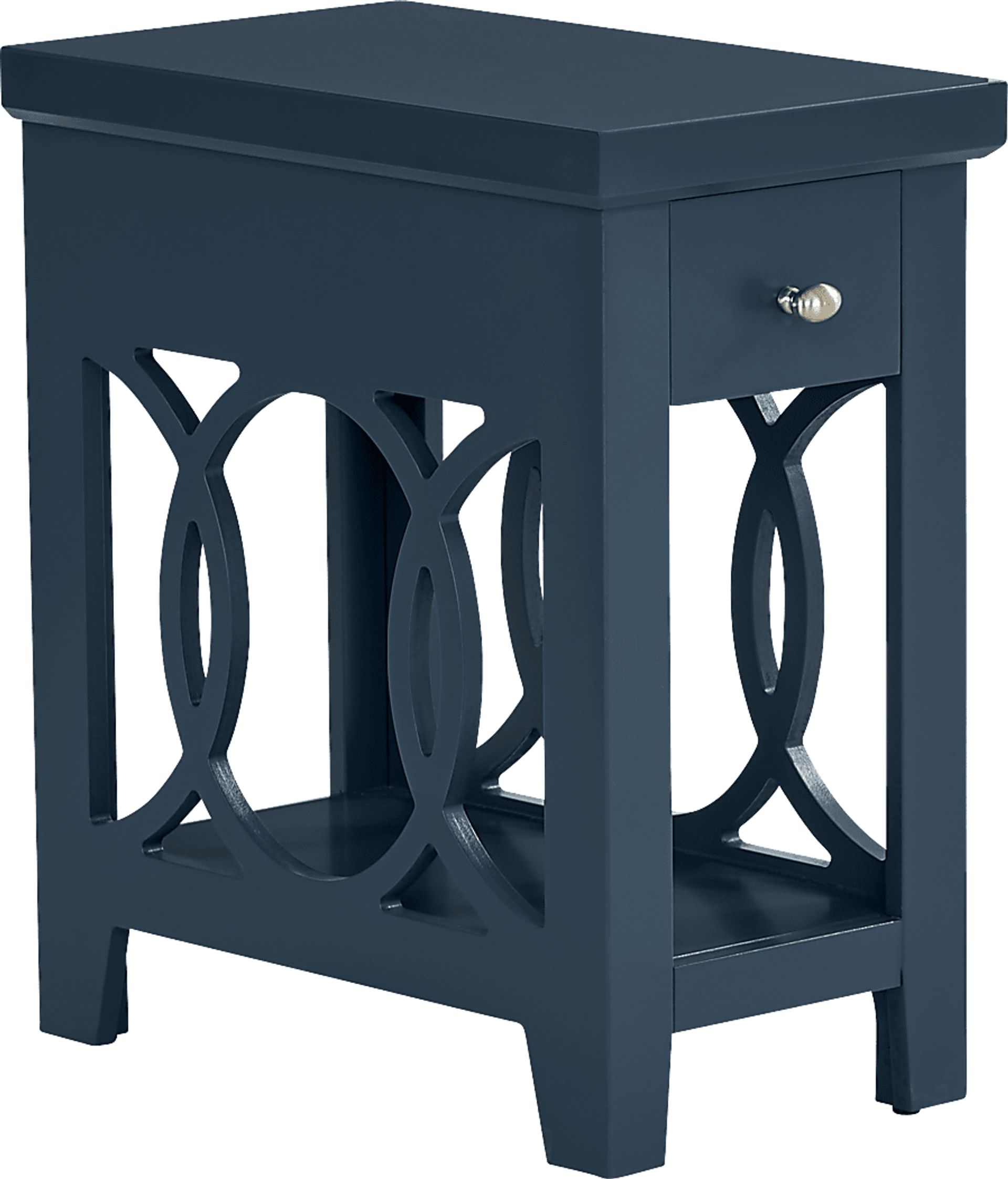 Expand your storage options in traditional style with the Abbie side table. Crafted with maple veneers in a beautiful navy finish, elegant intertwining wood details on either side add subtle flair. A convenient drawer with a metal pull offers discreet storage above the open shelf beneath.