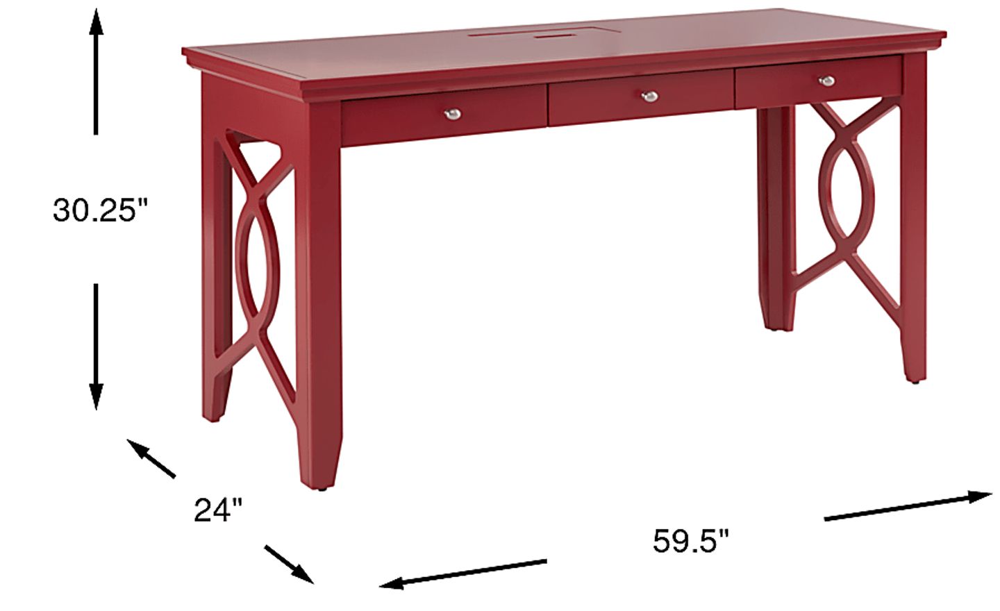 Enhance your home office space with the Abbie writing desk. Traditional in style, this versatile piece comes in a red color and features plenty of desktop space for your computer monitor, books, decor and more. The spiral-like design of the sides and brushed, silver-finished hardware on the drawer pulls each add an attractive edge.