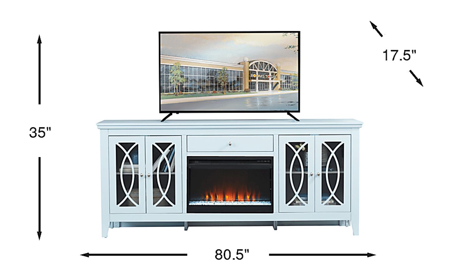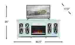 Expand your storage options and add warmth to your room with the Abbie console. Crafted with maple veneers in a beautiful sky blue finish, glass doors with detailing add a subtle flair to the piece. Each set of doors opens to reveal a convenient shelf. One drawer on the center of the console provides the perfect place to put manuals and more. The removable fireplace portion features a realistic energy-saving LED firebox with remote controlled heat and ambient lighting with four color changing options (LED color effects can be used with or without heat). When in use it can heat up to 400 square feet in a room and offers 50,000 hours of LED light. (Plugs into a standard home electrical outlet max. 120V and 60Hz.)