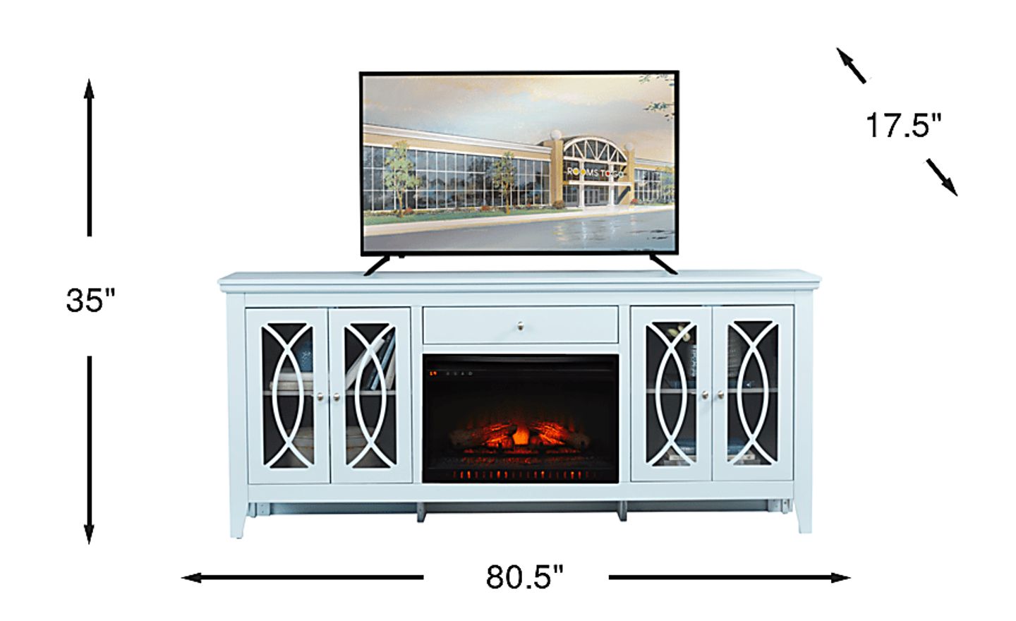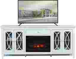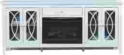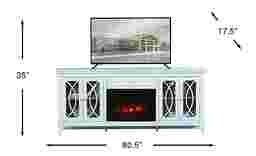 Expand your storage options and add warmth to your room with the Abbie console. Crafted with maple veneers in a beautiful sky blue finish, glass doors with detailing add a subtle flair to the piece. Each set of doors opens to reveal a convenient shelf. One drawer on the center of the console provides the perfect place to put manuals and more. The electric fireplace features innovative flame effects on bricks and logs for added depth and 3D realism. A convenient remote control adjusts the flame and glow levels and includes a built-in timer (from 30 minutes to 60 hours). The adjustable thermostat ranges from 62 degrees to 82 degrees.