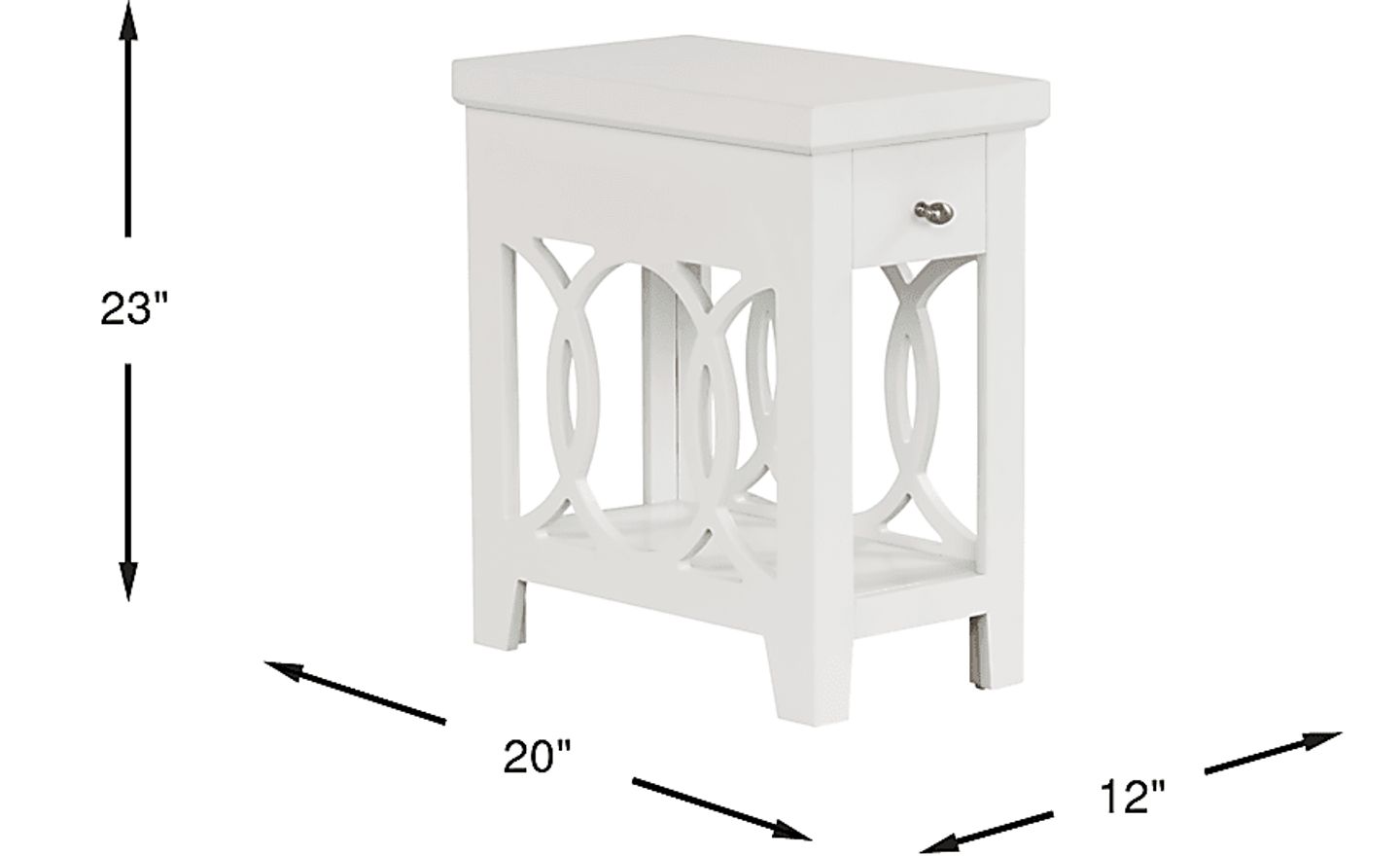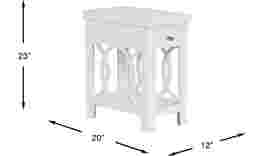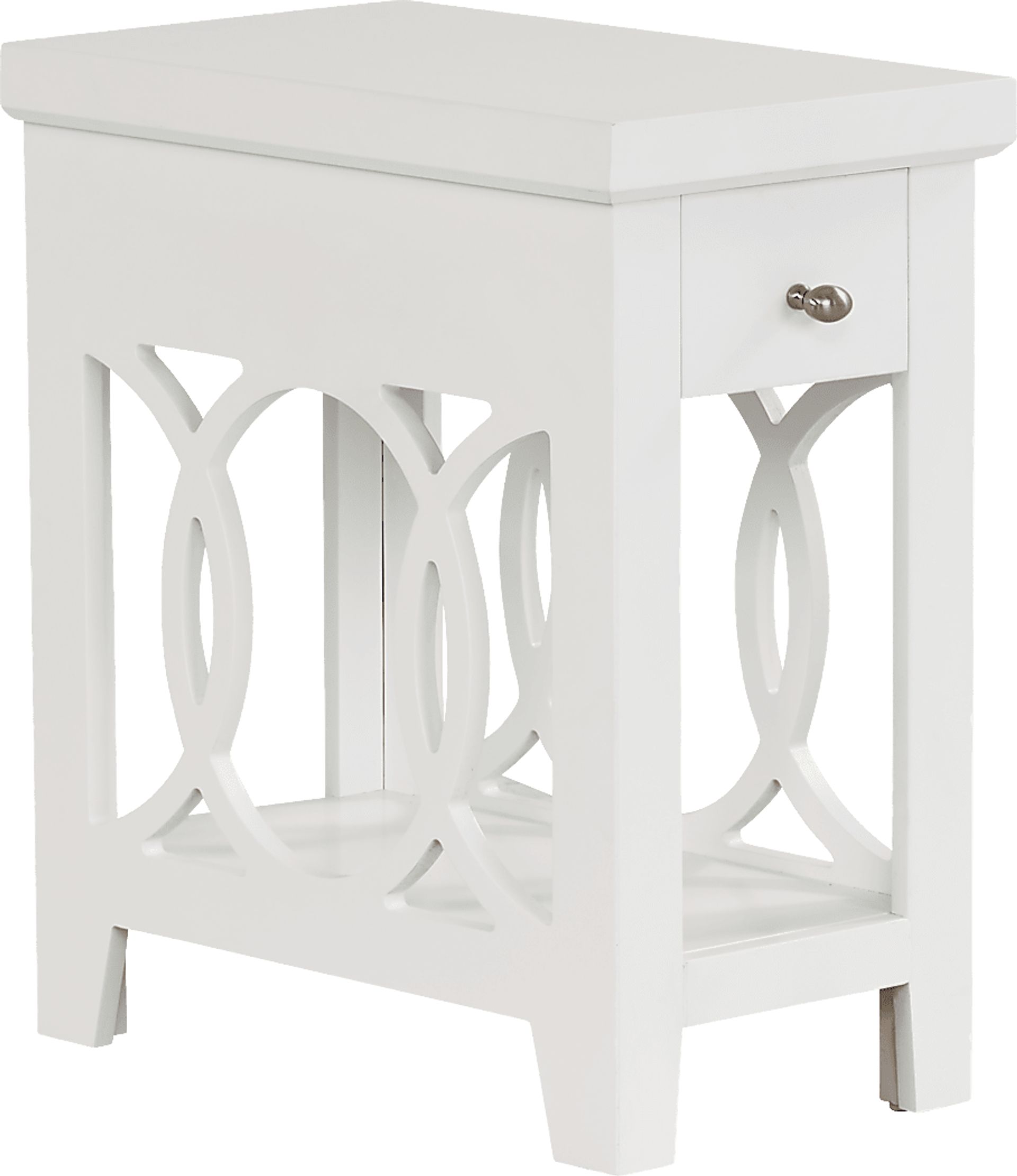 Expand your storage options in traditional style with the Abbie side table. Crafted with maple veneers in a beautiful white finish, elegant intertwining wood details on either side add subtle flair. A convenient drawer with a metal pull offers discreet storage above the open shelf beneath.
