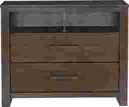 Combining contemporary style with practical storage the Abbott media chest accommodates a variety of items. Two open cubbies include a back panel with pass through holes for wire management. Each drawer is quality made with French and English dovetail construction. The two tone chest is crafted of wood solids with cherry and sapele veneers in a rich hazelnut finish.