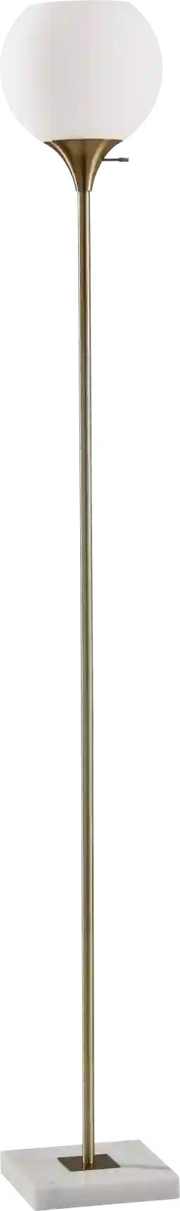 A simple silhouette is updated with high quality materials with the Abby Park torchiere. A square, white marble base keeps the lamp sturdy and strong while adding elegance to the look. Antique brass metal is softened with a globe shaped opal glass shade that lights up with a warm, room filling glow. A 3-way rotary switch is located on the socket. A clear, barely there cord trails neatly from the base. Customer assembly is required.
