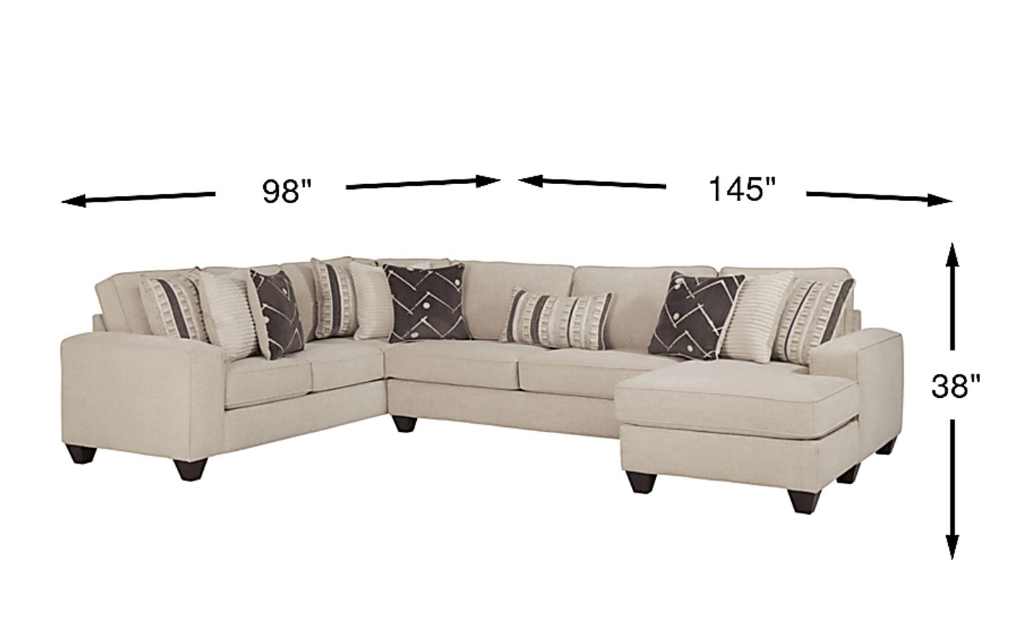 With a width of 145 inches, this is a generously sized piece designed to maximize seating capacity. While it has a significant footprint, its clean track arms and modern lines prevent it from feeling visually "heavy" or bulky in a room. Before purchasing, we recommend measuring your entryways and hallways to ensure they can accommodate the sectional's dimensions (145"w x 98"d x 38"h), as its contemporary scale is best suited for medium to large living areas.