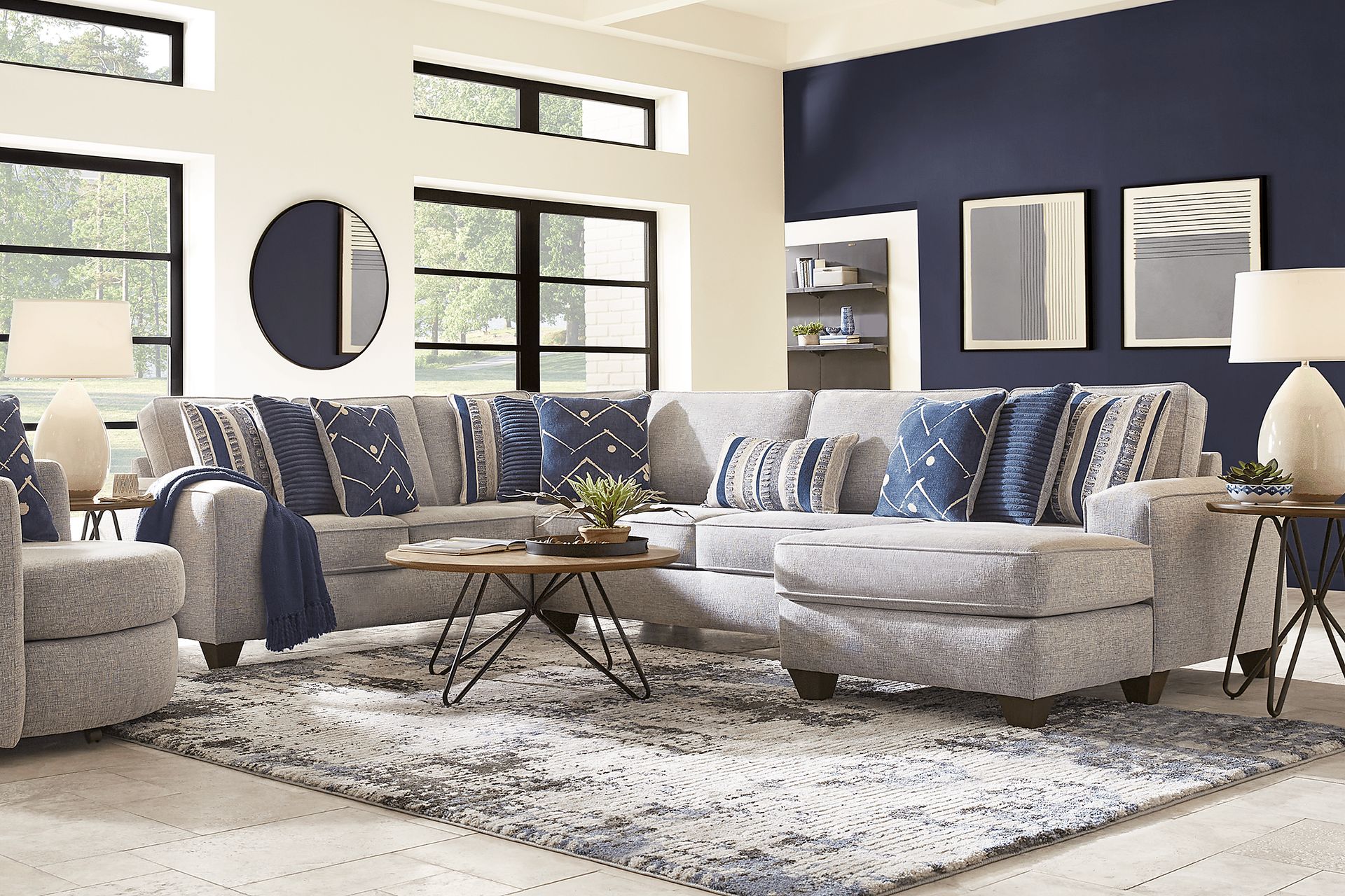 Reimagine your living space with the contemporary Aberlin Court sectional. Boasting clean lines and welted seams, this piece offers a modern look with a touch of texture. Sinuous wire springs ensure durability, while the chaise provides additional seating and an opportunity to kick up your feet. Upholstered in woven fabric, this sectional comes in a beautiful blue hue. Sleek track arms deliver comfortable support for those looking for convenient relaxation. Merlot-finished pyramid legs combine fashion with function as they support the padded frame. Soft, patterned accent pillows provide pops of visual interest. Loose seat cushions help extend the lifetime of your sectional. Upholstery: 100% Polyester