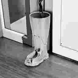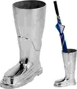While the fireman's boot is a novelty theme, the sleek silver color and polished finish give this stand a distinctly modern and elegant appeal. The smooth contours and realistic detailing, such as the tread pattern, serve as a striking conversational piece that adds character to contemporary entryways, mudrooms, or even professional offices.
