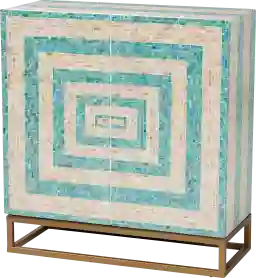 Spirited design and handy efficiency combine in the Abiathar blue accent cabinet. This bohemian piece consists of a sturdy wood frame intricately adorned with natural mother of pearl. The doors open to reveal two spacious shelves ideal for organizing and decluttering busy areas of your home. The Abiathar will arrive fully assembled and utilizes an openwork metal base for excellent stability and support in sleek design. With a captivating geometric display, the Abiathar is sure to become a beloved fixture of any setting.