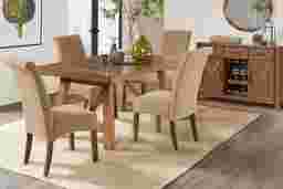 Introduce a new look to your dining space with the beautiful Acorn Cottage dining room. Designed in a stunning transitional style, this set will certainly become a focal point for dinner time and other gatherings. For flexibility, the table has two 13-inch leaves which expand the table to 96 inches. Constructed with acacia veneers and finished in a rich brown color, this collection has lasting style that is perfect for your home. Upholstered side chairs boast a versatile brown color.