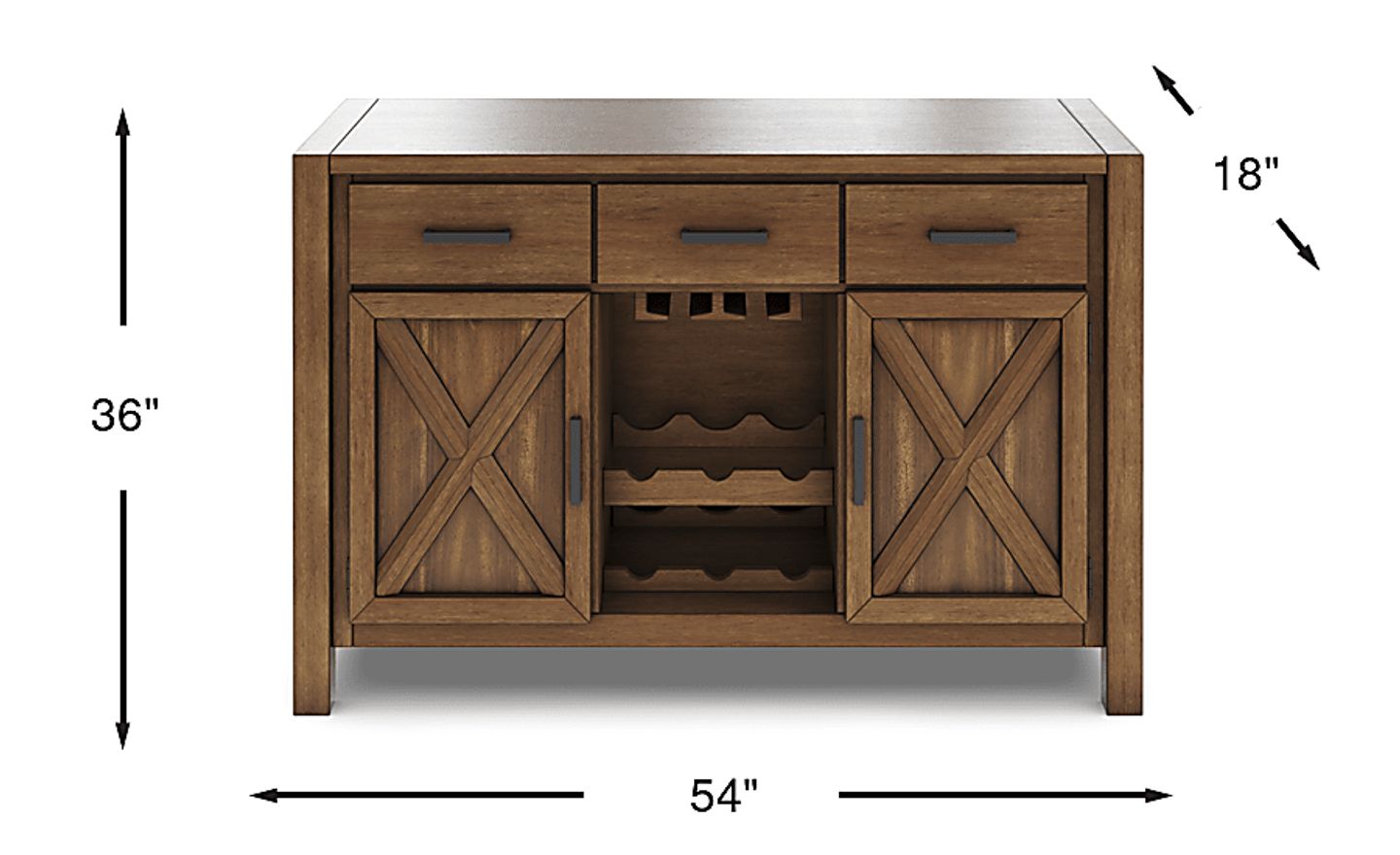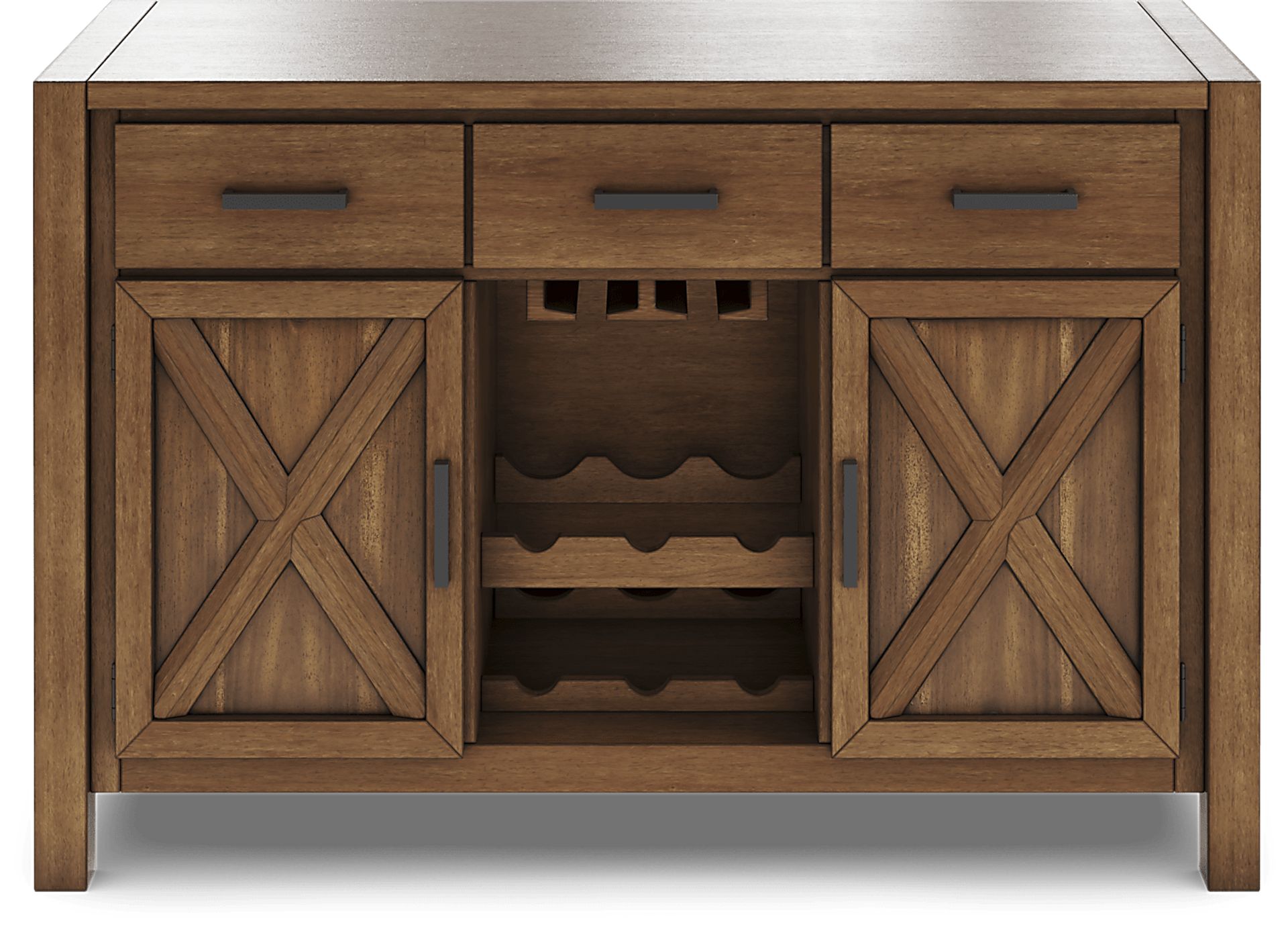 Keeping necessities close at hand is easy with the Acorn Cottage server. Featuring three drawers, two cabinets with a shelf each and a wine rack in the middle, you'll never be short on storage. Made with acacia veneers in a rich brown finish and featuring X shaped paneling on the cabinet doors, this piece perfectly accents the table and chairs of the Acorn Cottage collection.