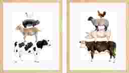 Farm animals provide a whimsical take on how to balance in the Act of Balance artwork set. Matted in white and framed in a natural wood finish molding.
