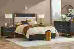 Charmed with allover cosmopolitan appeal, the Addison Street collection offers utter excitement from every angle. Crafted with oak veneers, the queen bed features a headboard upholstered in gray fabric and reeded wood details that are echoed by the low-rise footboard. Overhead lights offer perfect illumination for reading and more. The coordinating dresser has six drawers, each constructed with front and back English dovetail joints with side-mounted, full extension ball bearing glides. Gold finish on the dresser's tapered legs and drawer pulls deliver an ornate final touch alongside the round mirror's beveled glass. Mattress and foundation (if required) sold separately. Bed shown is queen size.