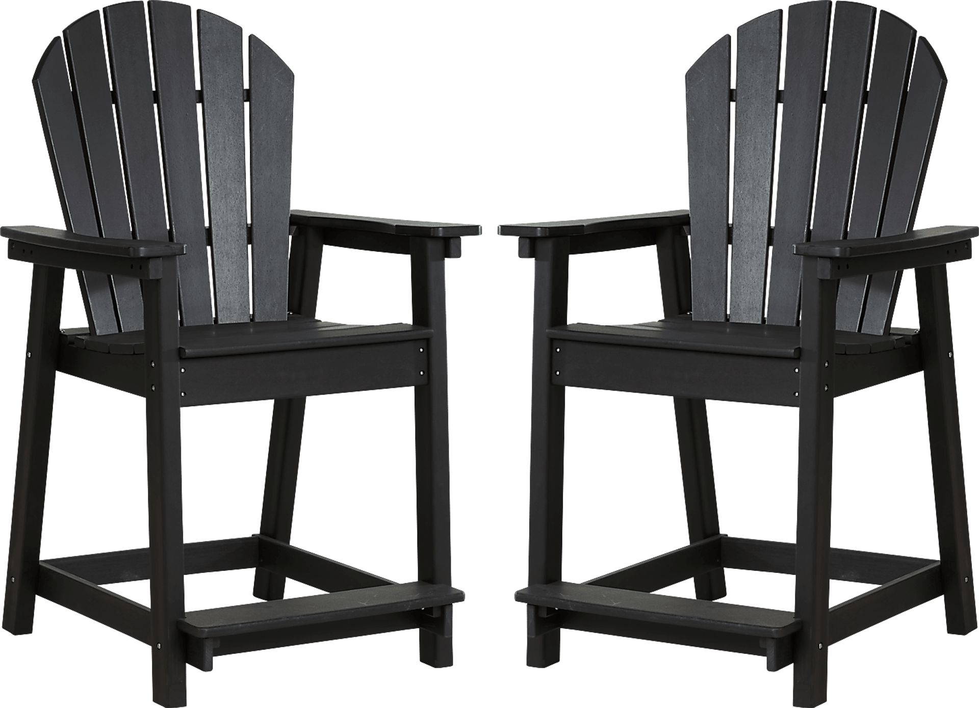 Typical a typical outdoor seating experience to new heights with this pair of Addy Adirondack balcony stools. Long legs, spacious backs and wide arms define the interesting design of these stools while a black finish makes them a versatile option for any patio. Solid construction with durable, fade-resistant materials offers a perfect, low-maintenance seating set for your outdoor living area.