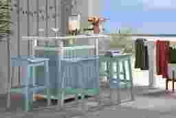 As perfect for serving up summertime libations as it is for hot cocoa in winter, the Addy bar set offers a versatile mainstay for any time of year. Crafted from strong, durable materials for low-maintenance enjoyment, the bar-height table features a vibrant sky-blue finish for easy coordination with four matching barstools without backs. Discreet shelving underneath the bar top provides seamless storage for your bar essentials.