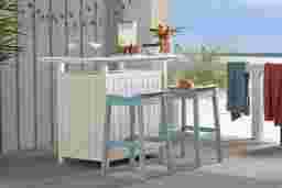 As perfect for serving up summertime libations as it is for hot cocoa in winter, the Addy bar table offers a versatile mainstay for any time of year. Crafted from strong, durable materials for low-maintenance enjoyment, this bar-height table features a vibrant white finish for easy coordination with existing pieces on your patio. Discreet shelving underneath the bar top provides seamless storage for your bar essentials.