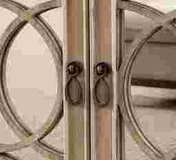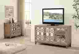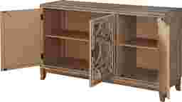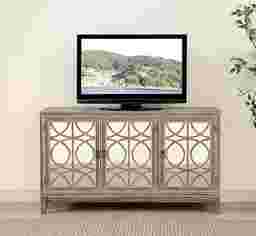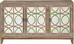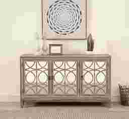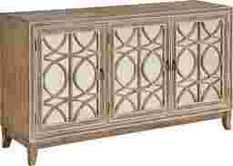 The fretwork that overlays the mirrored door fronts on the Adkisson three door credenza feature a fascinating fluid pattern. Beautifully framed by the clean lines of the cabinet, these doors open to a fully shelved interior complete with a built in cord management system. It is finished in light brown and metallic to add just a hint of silver to the rich wood finish. Customer assembly is required. Customer assembly required.
