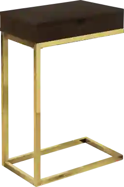 This beautiful cappuccino finish rectangular Adlai accent table is a great addition to any living room, family room, or home office. With sufficient surface space for snacks, drinks, or tablet as well as a convenient storage drawer that slides out on either side for remotes, coasters and other accessories, this table is perfect for movie night, snacking in front of the TV or entertaining guests during the big game. The gold metal base provides sturdy support along with a fashionable touch that will suit any decor. Customer assembly is required.