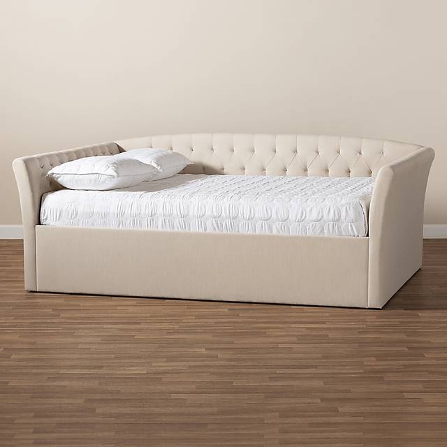 The Admiral Lane daybed brings comfort and versatility to any space. Crafted from wood and upholstered in beige polyester fabric with padded for foam for the utmost luxury. Featuring elegant button tufting and flared arms for a classic yet refined look. Add your favorite throw pillows to create the coziest environment during the day or night. Customer assembly is required.