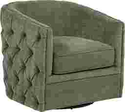Gentle laughter drifts through warm shadows as the Adriana swivel chair provides good company with a vintage-inspired silhouette wrapped in mossy green fabric. Button tufting softens the curve of its barrel seat outline to invite a closer look. Subtle nailhead trim forms a neat line across the arms while a smooth swivel base is the perfect conversation starter. Upholstery: 100% polyester.