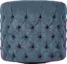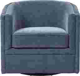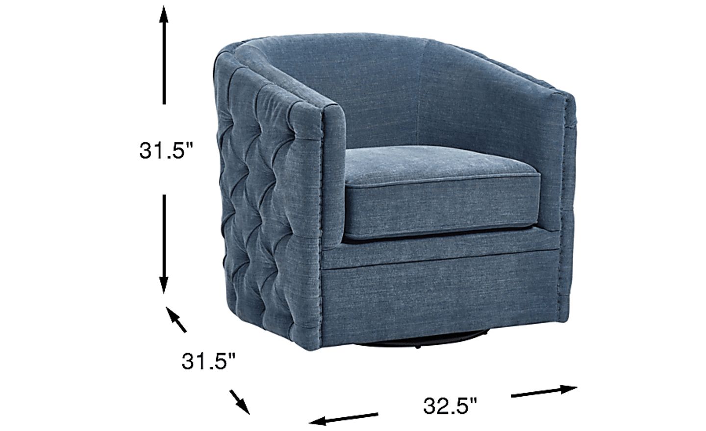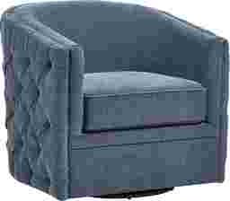 Gentle laughter drifts through warm shadows as the Adriana swivel chair provides good company with a vintage-inspired silhouette wrapped in navy blue fabric. Button tufting softens the curve of its barrel seat outline to invite a closer look. Subtle nailhead trim forms a neat line across the arms while a smooth swivel base is the perfect conversation starter. Upholstery: 100% polyester.