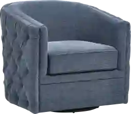 Gentle laughter drifts through warm shadows as the Adriana swivel chair provides good company with a vintage-inspired silhouette wrapped in navy blue fabric. Button tufting softens the curve of its barrel seat outline to invite a closer look. Subtle nailhead trim forms a neat line across the arms while a smooth swivel base is the perfect conversation starter. Upholstery: 100% polyester.