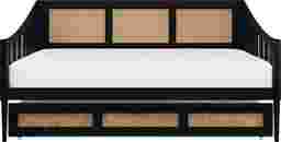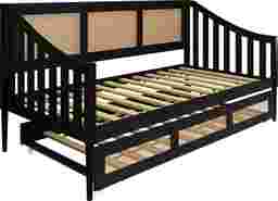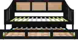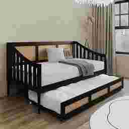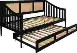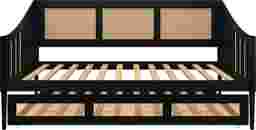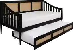 Discover the perfect blend of style and functionality with this Adrihen twin daybed with a twin trundle, ideal for accommodating guests or maximizing space. Featuring a unique rattan design on the high back and sloped side arms, this daybed stands out in any room. Designed to support up to 300 lbs for both the upper bed and trundle, it ensures durability for daily use. The included slat kit provides robust mattress support without the need for box springs, enhancing its modern appeal. The recommended mattress thickness ranges from 8-12 inches for the upper bed and 8 inches for the trundle. Customer assembly is required.