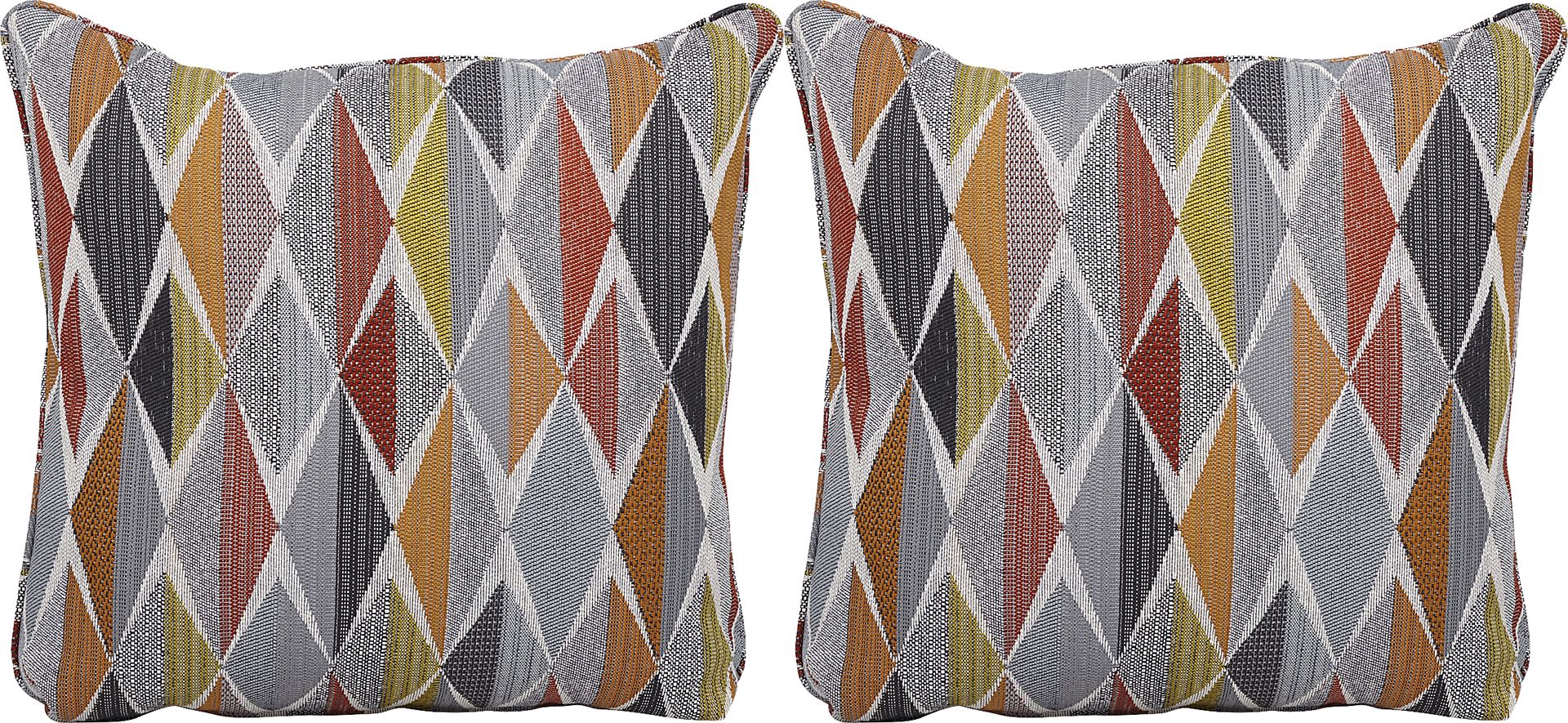 Contemporary style and a geometric motif make the Agler Spice accent pillows an enticing choice. The diamond patterned design is rendered in shades of gray, red, orange and cream. The stylish 19 inch square pillows come in a set of two. 69% Polyester, 31% Cotton
