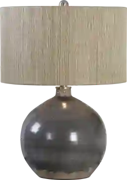 The Agnes Alley lamp is a style statement that brings the perfect amount of warm, ambient lighting to your bedroom or living room. Featuring a heavily crackled charcoal gray ceramic glaze with a rust brown undertone accented with plated brushed nickel metal details. The round hardback drum shade is a textured woven rattan. Partial assembly may be required.