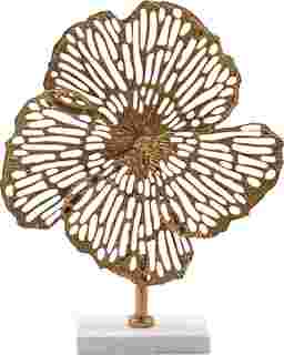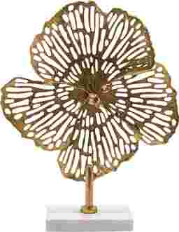 This piece is expertly crafted with a gold-finished metal body featuring a solid inner core for structural integrity. The intricate, perforated outer petals are designed for visual lightness, while the entire sculpture rests on a solid white marble base. This combination of heavy natural stone and high-quality metal ensures the piece feels as substantial and premium as it looks.