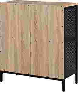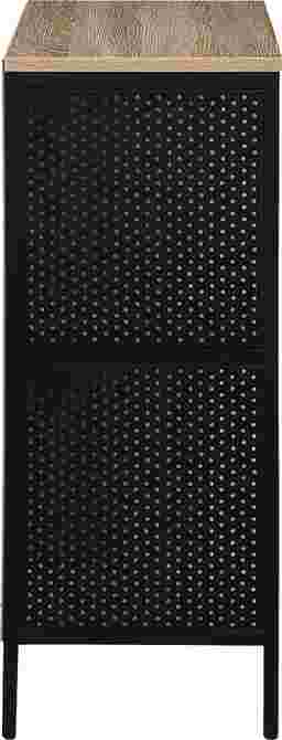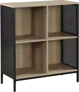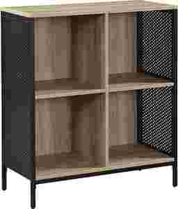 Solve your practical storage solution in style with our Ahron wood and metal storage bookshelf! With 4, 13" x 13" cube shelves, this bookshelf is the perfect size for storing books or plastic tubs. The woodgrain finish and perforated metal sides give it a modern industrial style and that will elevate any room and the sturdy metal frame with center support will add long-lasting durability and strength. Customer assembly is required.